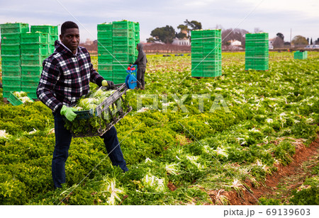 African farmer carrying boxes with curly endive