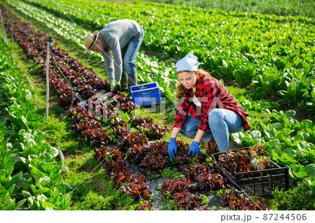 Young woman gardener harvesting red lettuce on farm field