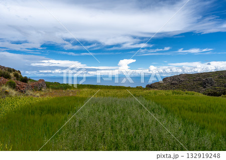 Lush green landscape overlooking Lake Titicaca from Llachon, Peru