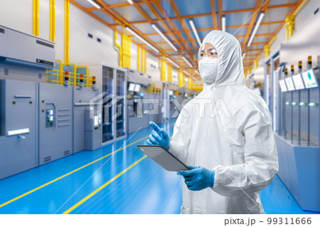 Worker or engineer wears protective suit or coverall suit work in semiconductor manufacturing factory