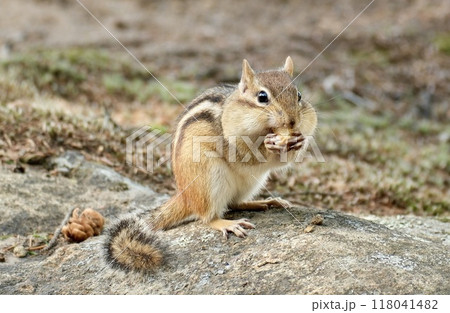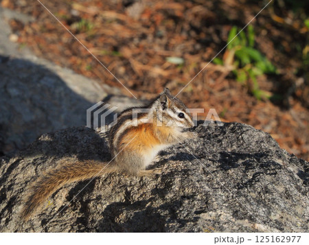 岩の上で朝日を浴びて木の実を頬張る可愛いチップモンク
