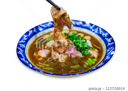 Top view of Chinese clear soup and Beef noodle and chopsticks ,die cut on white isolated, focus selective