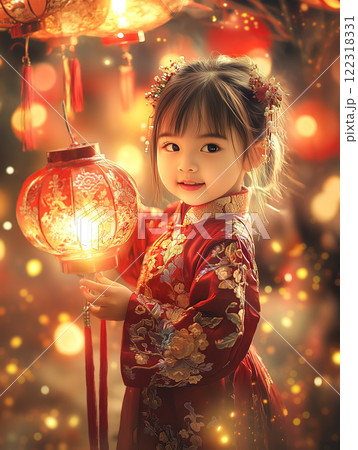 A Chinese kid joyfully holds red lanterns, surrounded by festive decorations. The concept of Chinese New Year, tradition, celebration, and cultural heritage. Generative AI.