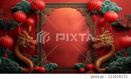 Dragon, lanterns on festive Chinese New Year background in traditional Asian decor. Generative AI