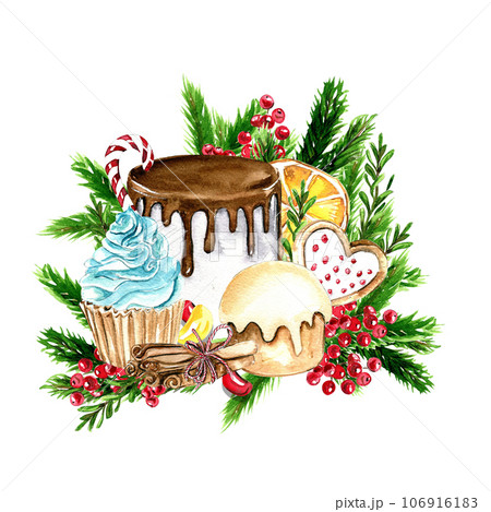 Composition for Christmas. Gifts, cupcake, cake,cookies,fir branches.Composition for Christmas. Gifts, cupcake, cake,c ookies, fir branches.Watercolor hand drawn illustration. Winter holiday.
