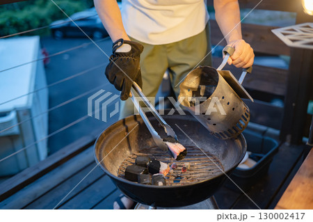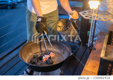 バーベキューで火起こしをする男性
