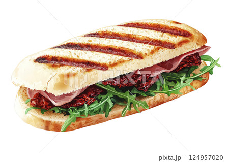 Authentic Italian panini with prosciutto, arugula, and sun-dried tomatoes, on a white background