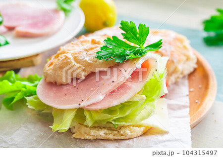 smoked salmon ciabatta with cream cheese to make a sandwich on wood board