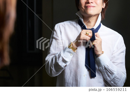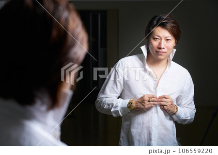 鏡の前で支度をするアクセサリー好きの男性 メンズジュエリー ファッション イメージ