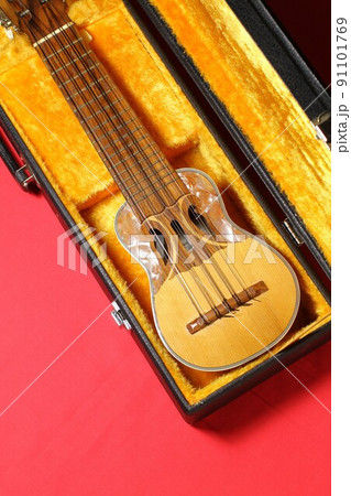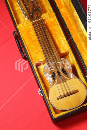中南米音楽の民族楽器、ケースに入ったチャランゴ、赤バック