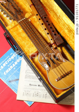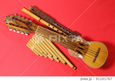 中南米音楽の民族楽器、チャランゴと笛、赤バック