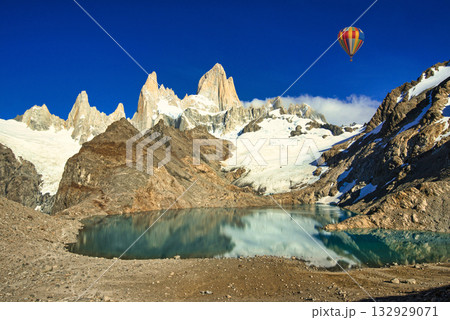 アルゼンチン・パタゴニア地方にて朝のフィッツロイ山頂とロストレス湖