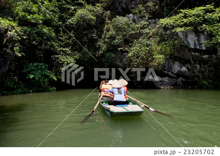 ベトナムハノイ 渓谷の川を手漕ぎのボートで進むニンビンのボートツアーの漕ぎ手