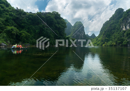 ベトナムハノイ 渓谷の川を手漕ぎのボートで進むニンビンのボートツアーの観光客