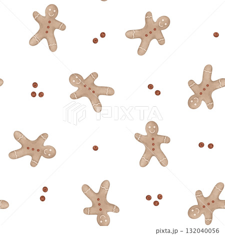 Watercolor hand-drawn seamless pattern with Christmas illustration gingerbread man and red berry holly. New year repeat print for design textile or wrapping paper with cookies.
