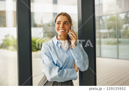 A young woman smiles on the phone in a bright, modern office with contemporary design