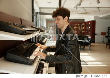 A talented musician smiling joyfully while playing an electronic keyboard inside a modern store