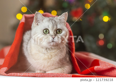 Festive white cat with green eyes wrapped in red blanket by christmas tree