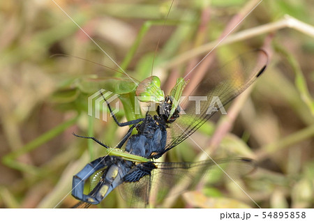 カマキリ(チョウセンカマキリ)がオツネントンボを捕食している