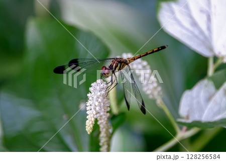 ハンゲショウの花で一休みするハッチョウトンボの メス