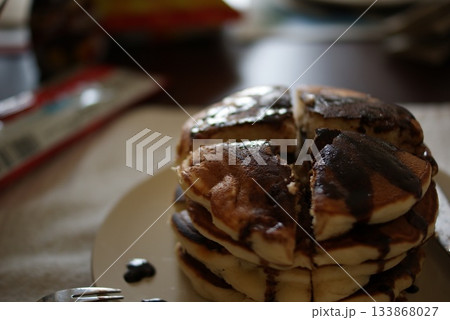 ふんわり重ねたパンケーキにチョコソースをかけた甘いブレックファスト