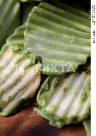 アカシアプレートに乗せたギザギザカットの抹茶チョコポテトチップス