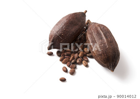 fresh cocoa fruit with half sliced and seeds isolated on white background.