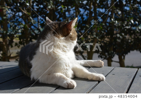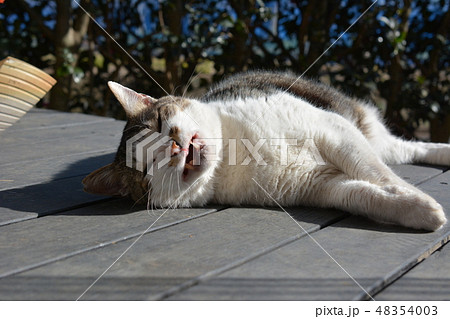 デッキでくつろぐ、ごろにゃんジャンボチョビひげ猫さん