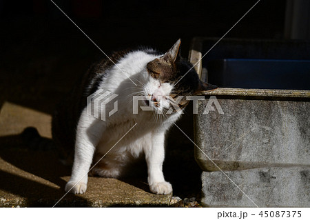 デッキで毛づくろい、ジャンボチョビひげ猫さん