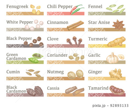 水彩風のスパイス。カレーなどインド料理の香辛料。ベクターイラスト素材