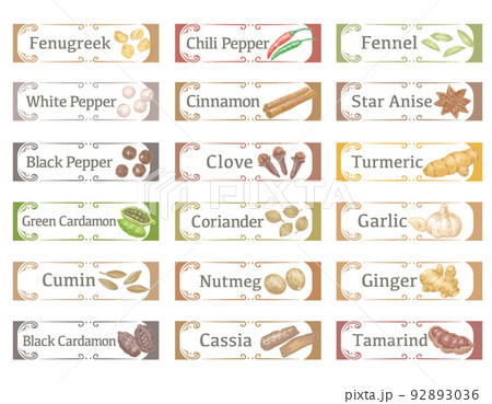 水彩風イラストを使ったカレースパイスのラベル素材。 ベクターイラスト。