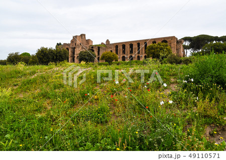 ローマ市内の古代遺跡(イタリア) チルコ・マッシモの赤白の花とパラティーノの丘