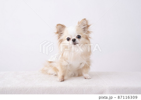 クリーム色のチワワがお座りをしている様子