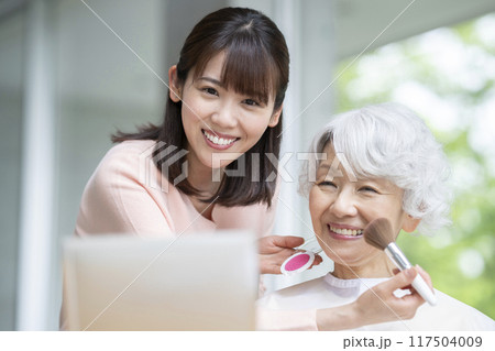 シニア女性にメイクをするヘアメイクアーティスト