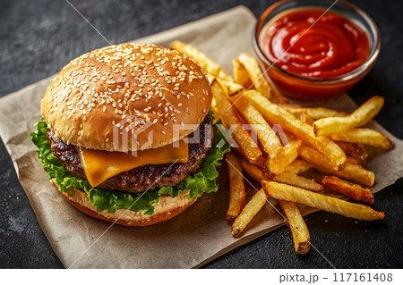 Close-up of a tempting cheeseburger with lettuce, tomato, cheese, and fries on the side. Generate AI