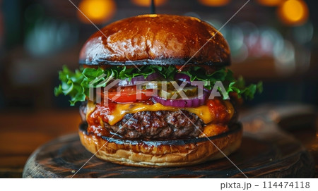 A Juicy and Delectable Hamburger, Celebrating the Classic American Comfort Food. created with Generative AI
