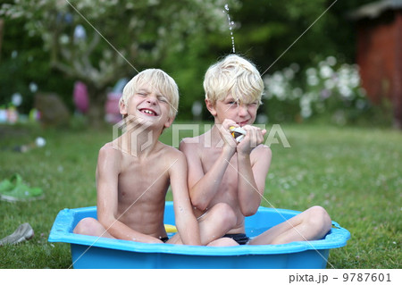 Kids playing with water in little plastic bath outdoors in the garden at the backyard of the house