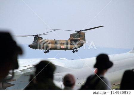 航空自衛隊美保基地航空祭で行われた陸上自衛隊の輸送ヘリ・チヌークの展示飛行