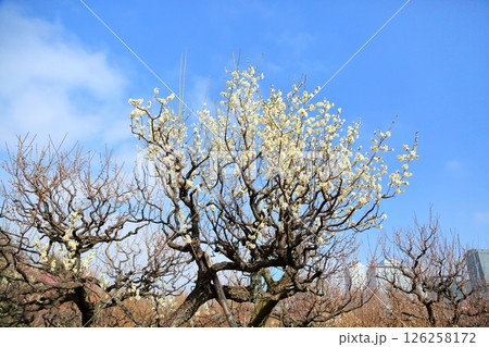 都市農業公園(東京都足立区)の梅の花と青空の風景