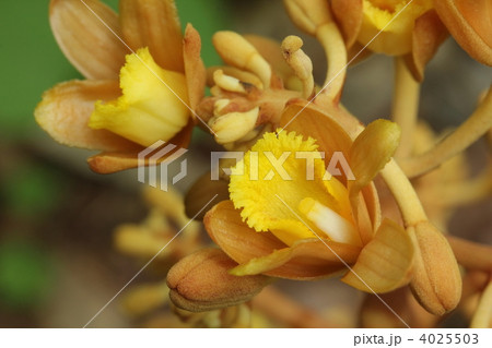 六甲の山で見られた淡い茶色の花径に咲いた唇弁の内側が黄色の花が綺麗な腐生植物のツチアケビ