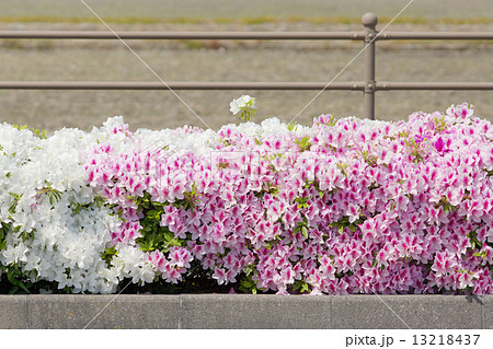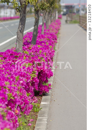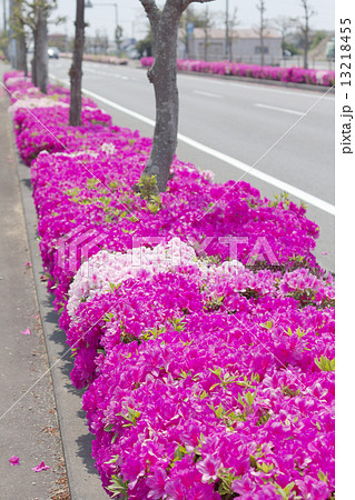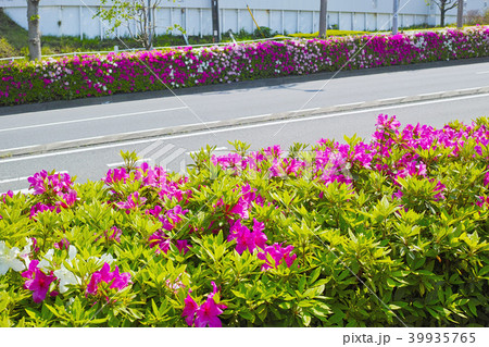 道路沿いに花が咲いたツツジの植え込み