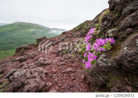 中岳をバックに高千穂峰のガレ場に咲くミヤマキリシマ