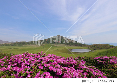 満開のミヤマキリシマの向こうに草千里と烏帽子岳が見える