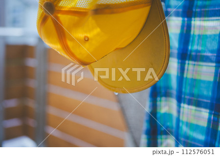 小学生の黄色い帽子を洗って干す