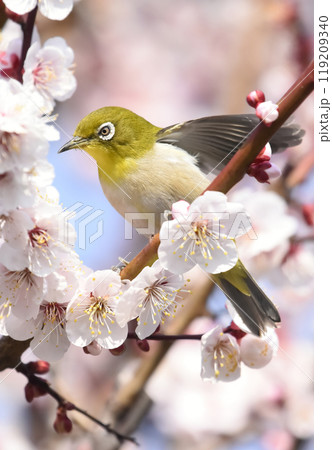 満開の紅梅にメジロさん ( 春イメージ )( ほのぼのイメージ )