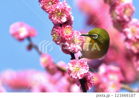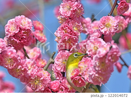 満開の紅梅にメジロ( 小春日和イメージ )( ほのぼのイメージ )