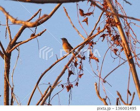 冬の荒川河川敷の枝にとまるジョウビタキ