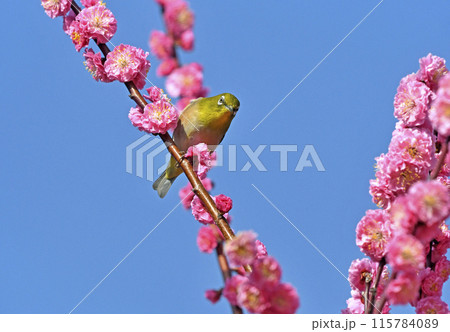 満開の紅梅でお食事中のメジロさん( 春イメージ )( ほのぼのイメージ )