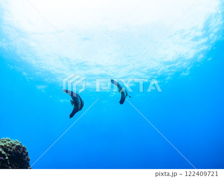 ペアの 大きく美しいツバメウオ(ツバメウオ属)他。 静岡県伊豆半島賀茂郡南伊豆町中木ヒリゾ浜2024