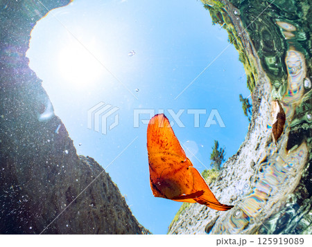 浅瀬を泳ぐ、美しいナンヨウツバメウオの幼魚の半水面撮影 静岡県伊豆半島賀茂郡南伊豆町中木ヒリゾ浜